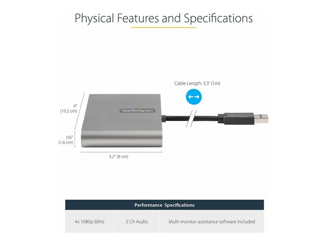 Startech USB 3.0 to 4 HDMI Adapter, External Video & Graphics Card, USB Type-A to Quad HDMI Monitor Display Adapter Dongle, 1080p 60Hz, USB 3.0 to HDMI Adapter/Video Converter, Windows