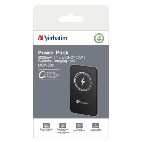 Trådløs power bank - magnetisk montering - Li-pol - 5000 mAh - 20 Watt - 2.4 A - Apple Fast Charge, PD 3.0, QC 3.0, Apple 2.4A, USB BC 1.2 (24 pin USB-C) - sort